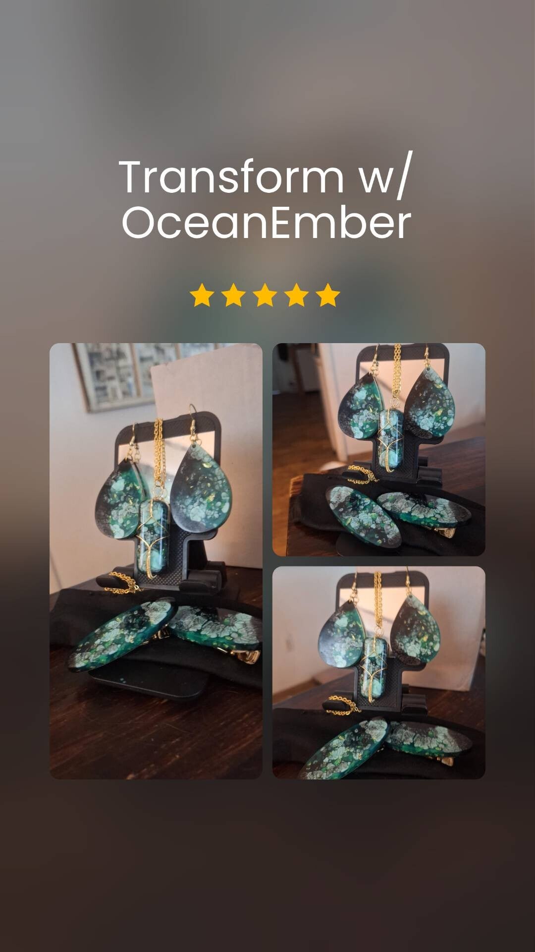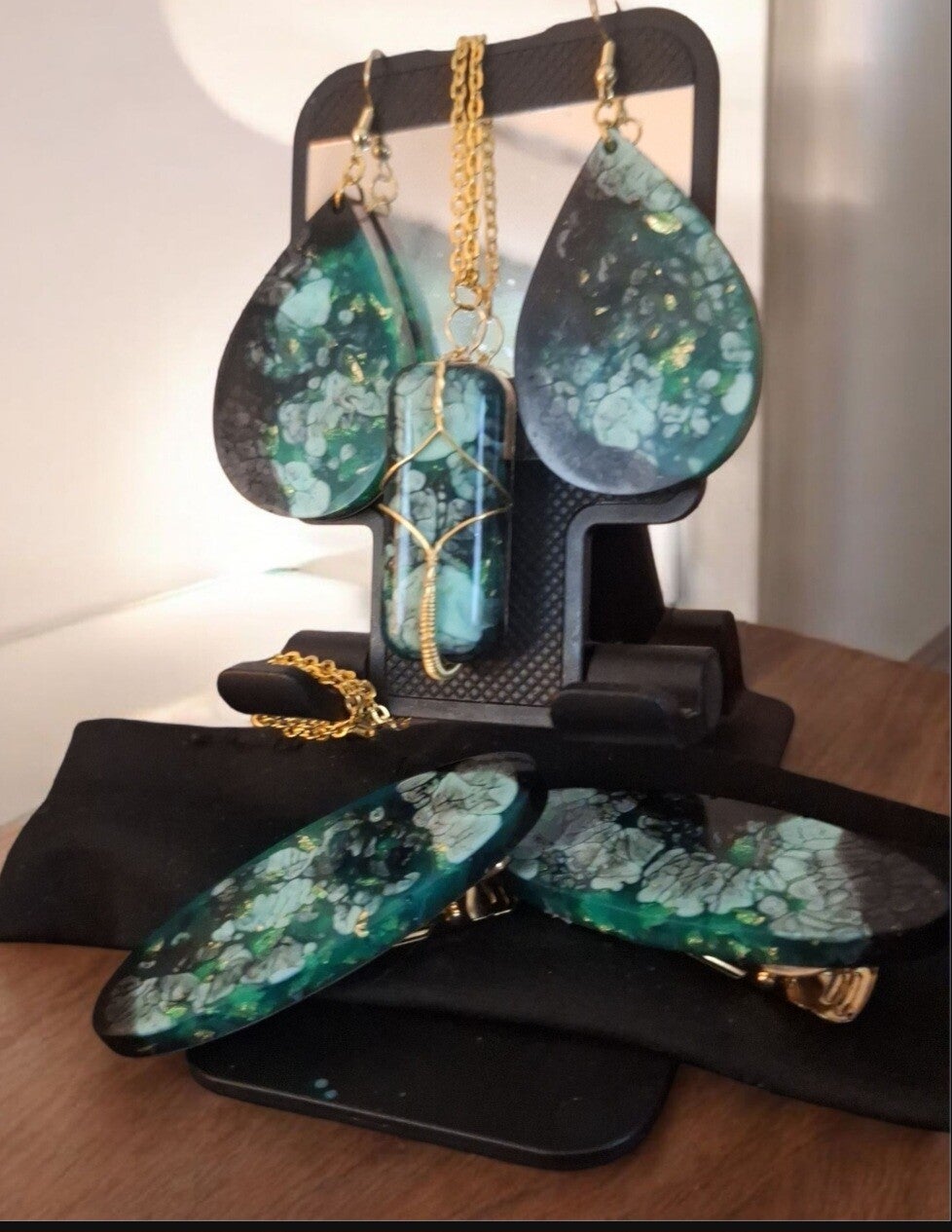 Elevate your look with this stunning handmade jewelry set inspired by the swirling beauty of nature’s fiercest storms. Featuring a rich mix of emerald green, black, white, and gold accents, this set is perfect for lovers of bold, artistic style.
